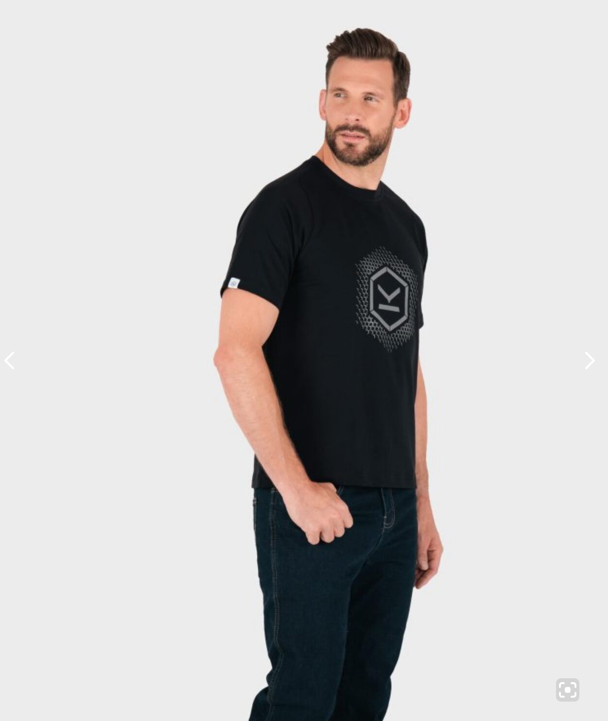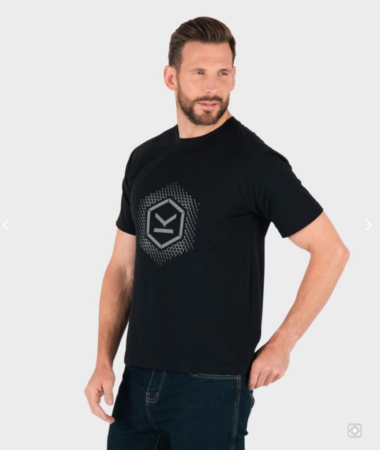 The Black Reflect Tee comes in black with a striking silver reflective design featuring a hexagonal print from the iconic Handriod Gloves. The tee is available in sizes S-3XL, it’s breathable with soft cotton elastane, a unique raglan sleeve shape and reflective front and back print so you can be seen under the spotlights. Machine washable and easy to care for.